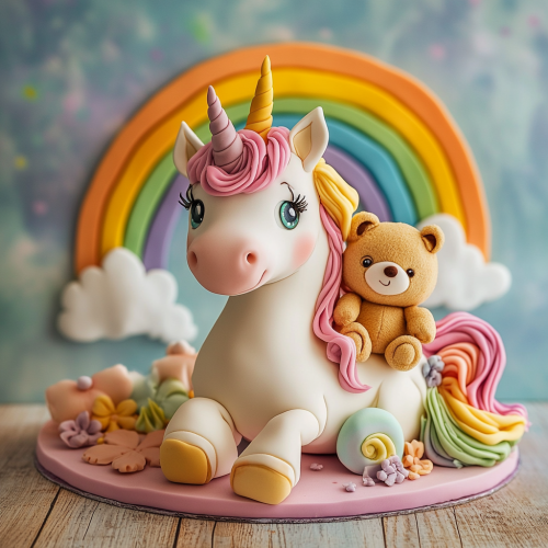 create an image of an unicorn which is made out of cake. on the back there is a cute little teddybear sitting on its back. in the background is a rainbow --v 6.1
