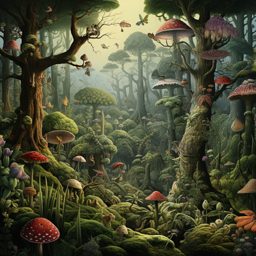 dungeons and dragons art of a tree in a lush green forest that is leefless and black. around the base of the tree are some dark purple mushrooms and black grass that contrast with the vibrant green of the rest of the forest