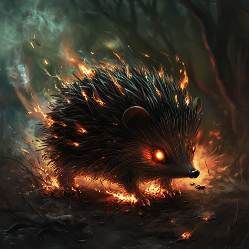 A small, mystical hedgehog with flames flickering from its spines.. Its body is covered in dark, charred quills, with embers glowing at the tips, and its eyes glow. The creature looks both fierce and magical, with wisps of smoke rising from its back as it moves. The atmosphere around it radiates heat, and the ground beneath it shows singed grass and small embers. The scene is set in a glowing, magical forest, with contrasting vibrant greenery and charred ground, giving the hedgehog a wild yet enchanting presence.