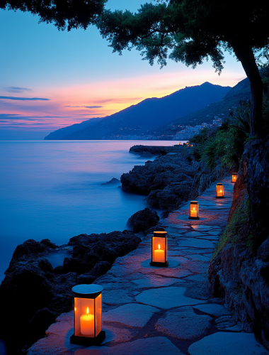 photo 8k très réaliste au lever du soleil, un chemin au bord de la mer, sur la côte amalfitaine éclairé par des bougies et des lanternes, il y a des petites lanternes suspendues aux branches des arbres. Atmosphère magique et chaleureuse. Il y a des citrouilles posées sur le long du chemin, ambiance sereine