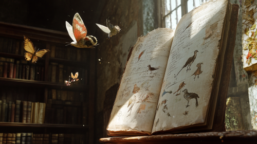 a photorealistic shot from an anamorphic movie. An extreme close up of a Victorian ledger in a Victorian study, the ledger is full of columns of figures . In the margins of the ledger are a child’s crude colourful drawings of rabbits, birds and butterflies. The drawings start to leave the page and animate --ar 16:9