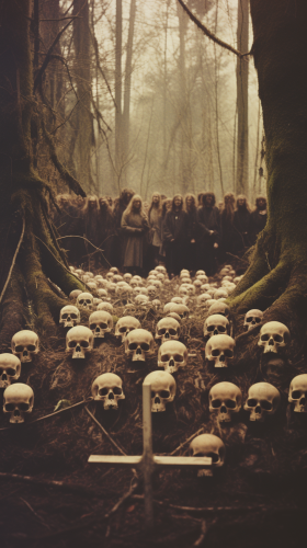 1980's Polaroid photo of a creepy cult worshiping in the forest, skulls lay all over the moss covered ground, --ar 9:16