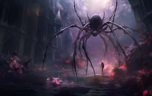 A magical, dreamlike spiders in the style of james paick, glamour, Amethyst, Volumetric Lighting, Solarized, Shimmering, Masterpiece, Fine Art --ar 16:10