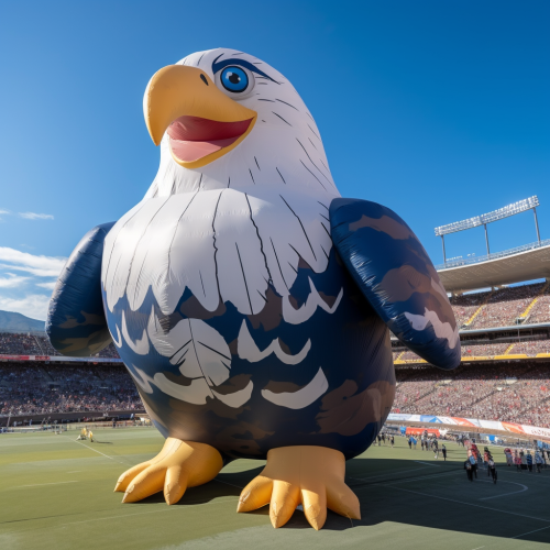 Inflatables bald eagle mascot, in the sky, with a big soccer ball in the sky over the aztec stadium, realistic, photographic from the stadium, - ar 16:9