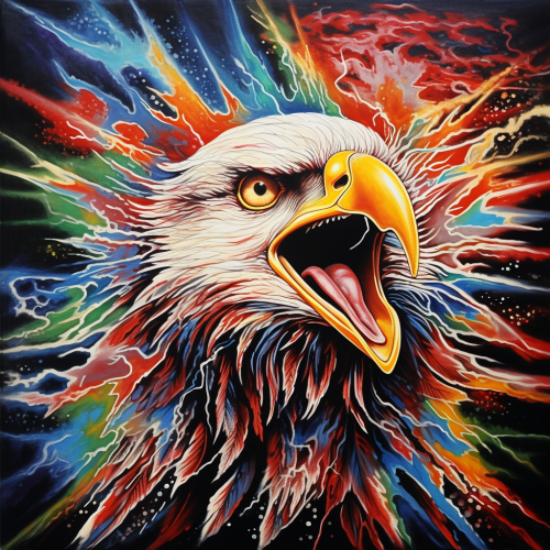 png white background, An eagle soaring high above a vast landscape, its sharp eyes scanning the horizon. The scene captures the eagle's perspective from a great height, in the style of animated illustrations, Ian Miller Style, use the colors: Maximum Red, Raspberry Pink, Blue Yonder, Cornflower, and Raw Sienna , grain texture full body, text-based --style raw --v 6.1 --s 250