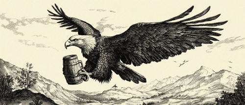 intage illustration, hand drawn, engraving, black ink, 1700s, 1800s, bald eagle, clutching wooden beer stein in talons while flying, rolling hills in background, fall season --ar 7:3