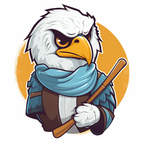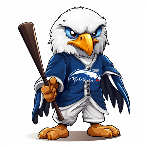 cute cartoon sports logo full body view of flying bald eagle, holding a baseball bat in talons, bald eagle head wrapped in blue tuareg scarf