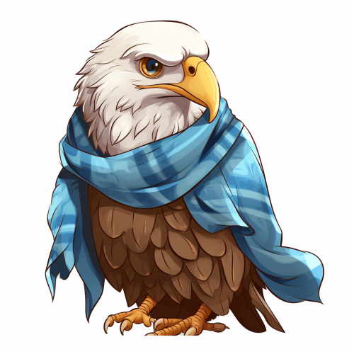 a cute cartoon bald eagle with a blue nomadic scarf wrapped around head and beak