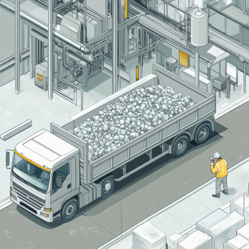 A schematic, technical drawing of a truck delivering large 1-ton bales of sorted recyclable plastic to a buyer's facility. The facility features machinery for shredding and converting plastic into pellets, with visible equipment and workers operating the machinery. The scene is set in an industrial area, with the bales being unloaded from the truck. The illustration should have a clean, blueprint-like style, with basic colors and clear lines, focusing on functional depiction and detail.