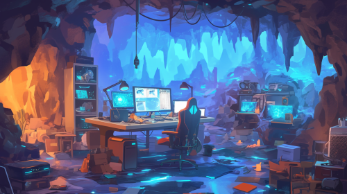 a streamer background screen, streaming room, large sprawling cave scene, messy computer room, food, debris, stalactites, furniture, scenic, detailed, --ar 16:9 --niji 6