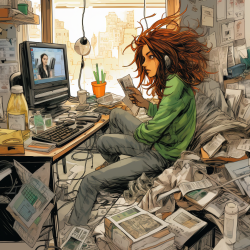 lazy officeman lying on sofa with phone in his hands, tablet, snacks and many other things on the littered sofa, 2d graphics --style raw