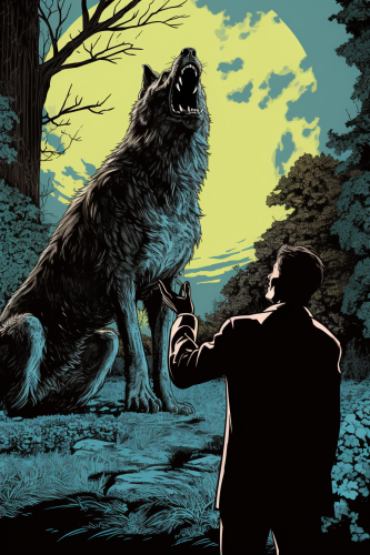 early 1900s horror comic art, the camera angle is pointing over a man's shoulder, the man is pointing at a screen, on the screen is displayed a rough rendering of a man being confronted by a large monstrous Dog Man outside a moonlit cemetery, the Dog Man is awkward looking and stands on his hind feet upright, --ar 4:3 --style raw