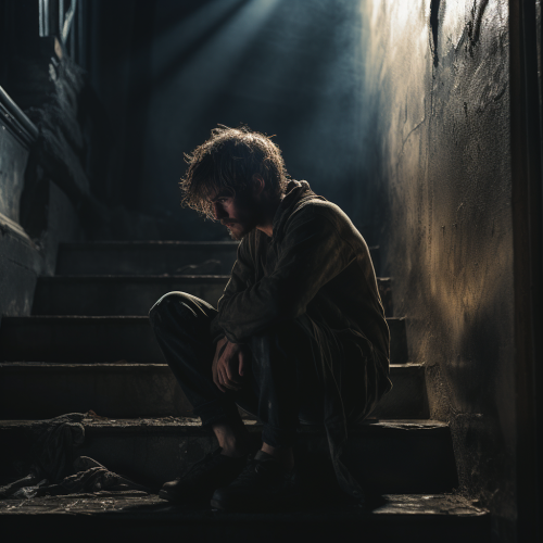 a man sat down on the stairs suffering but not showing it good back lighting dark and gloomy style