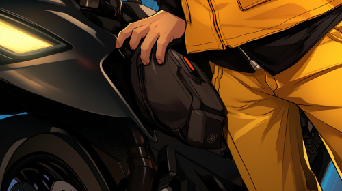 An overhead shot of the person riding an electric scooter, designed by Jony Ive and Dieter Rams in sleek grey metal with black accents, there's a pizza box on the back, captured at high speed to freeze motion, creating blurred background for focus on vehicle and rider, emphasizing modern design and performance --ar 128:85