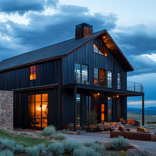Mountain modern, shop style barndiminium home, in montana by a like. Lots of metal, contemporary design, dark look. Multimillion dollar house, masculine.