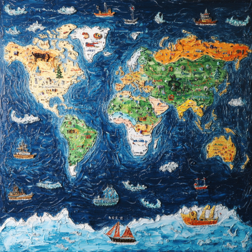 Draw a map of the world where the Pacific Ocean comes to the center. This is a world map drawing that is as good as submitting to a children's drawing contest. The theme of this painting is a world map in everyday life.
