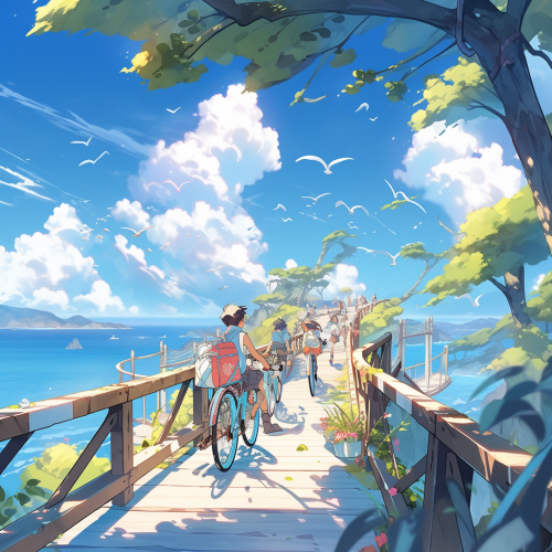 a cycling path bridge above the ocean with people riding bikes down it, 8k --s 250 --niji 5