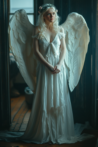 Fullbody shot of a female angel with an anthropomorphic appearance, super bright emerald eyes, symmetrical proportions, ethereal, pale, hypedetailed, kodachrome 64 professional, professional photo --v 6.0 --ar 2:3