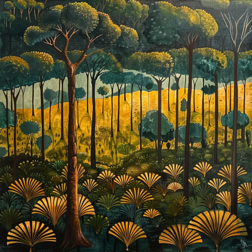 A cartoon image of a phantasmal landscape. There are no creatures in the landscape. It is well lit by a red moon and is lush with natural but other worldly vegetation. --ar 16:9