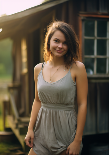 It's early morning and misty and the sun is just rising. A side view Darren Ankenman photo of Alysha Grace Marko, 30 . She's smiling, wearing no make up, standing casually outside a wooden shack next to the river, bored but happy, near Knoxville in rural America looking to the side, wearing a shift dress. muted colours. Modern clothing. Photo realistic. --ar 7:10 --v 5.2 --s 50