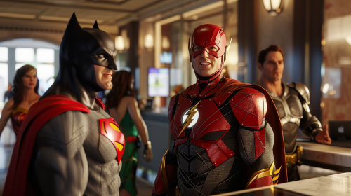 DC superheros smiling behind a counter at a modern bank branch. Reddish talking to people. photo realistic. 16K Resolution --ar 16:9 --v 6.0