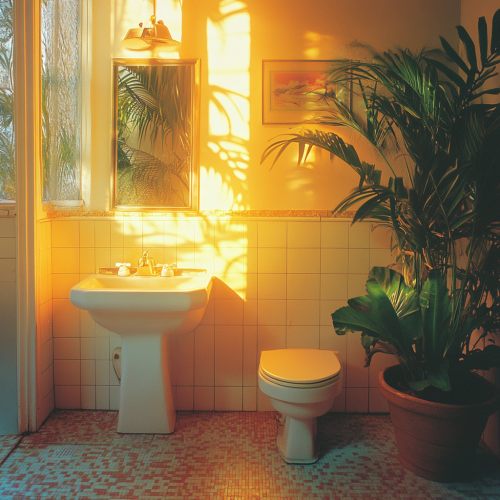 80’s Spanish villa with a toilet and a bathroom sink in the background a spa tub is in the bathroom a sunset is outside the window shot in Fuji superia X-TRA 400 resembles 80’s readers digest architectural design