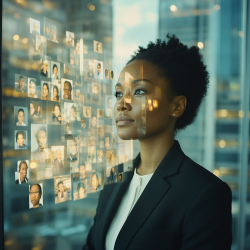 A professional and competent-looking Black woman in a suit, needing to make a hiring decision. She is in a tasetful, modern office space, looking thoughtfully out a large floor-to-ceiling window onto a large city. Projected onto the clear window are semi-transparent images of her thoughts and decision-making process – a cloud of headshots of the candidates, who are multicultural. Landscape orientation, 16:9 aspect ratio.