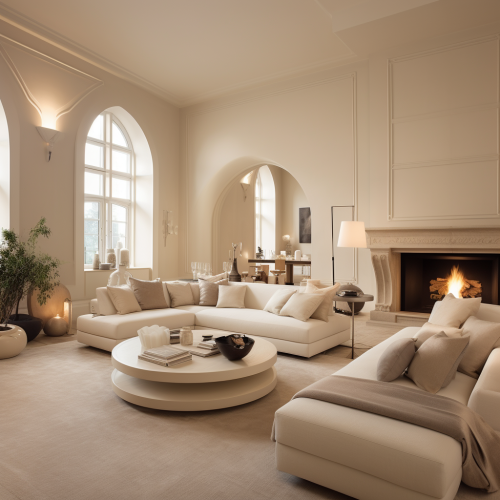 Living room with a large mirror in front of a window A bright living room with a large window beside which stands a large and well-designed mirror, framed in a natural wooden frame that complements the rustic furniture in the room. The natural light is reflected from the mirror and illuminates the entire space, which gives a feeling of spaciousness and a pastoral view that can be seen from a wide and high window. Paintings with fine and modern lines hang on the walls, and the furniture is in warm colors and combines wood and fabric. Place the mirror so that it duplicates the look of the sofa, pillows and window. --ar 7:5