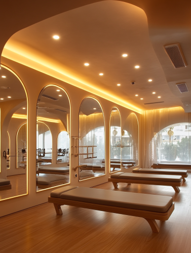 pilates room, on the wall there are arc shape mirrors, parquet flooring, invisible lights behind the mirrors, spot lights on the ceiling, rectangle room with a window, cadillac pilates bar in the room, --ar 3:4