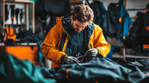 A technician repairing a torn outdoor jacket with sewing tools, surrounded by other returned gear awaiting refurbishment, eco-conscious workspace --ar 16:9