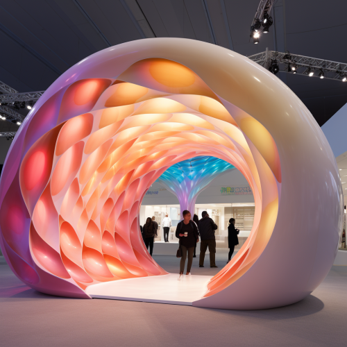 Design a sleek and modern trade show booth measuring 10x20 feet, prominently featuring the Allstate brand. The back wall displays a large, high-resolution Allstate logo with engaging visuals of families and homes. Include a 55-inch monitor displaying promotional videos, positioned centrally. In front, place a stylish bar table with four high-top chairs, all in Allstate's color scheme of blue and white. Soft LED spotlights illuminate the booth, creating an inviting atmosphere. The flooring should be branded carpeting matching Allstate colors. The overall design should be professional, welcoming, and visually striking, encouraging visitor engagement.