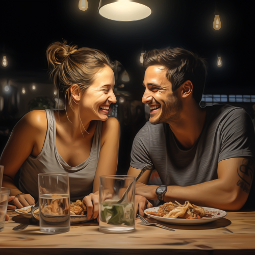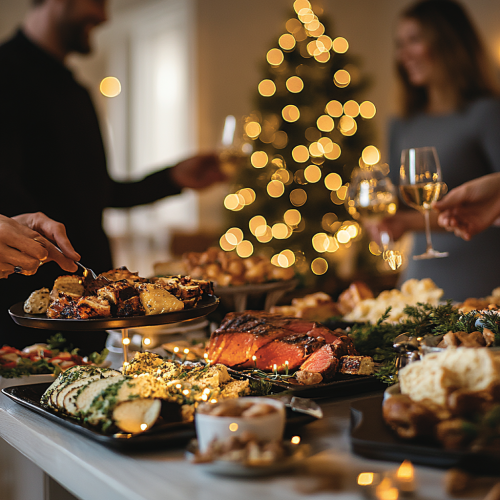 A cozy New Year celebration at home, with a group of people gathered around a beautifully set dining table, sharing a festive meal. The focus is on the delicious spread of food--roasted meats, salads, appetizers, and desserts like cakes and pastries--laid out on the table, glowing under warm lighting. The people are smiling and enjoying the meal together, toasting with glasses in hand. The background shows subtle New Year decorations, such as twinkling fairy lights, a small tree, and festive ornaments, creating a welcoming and intimate atmosphere.