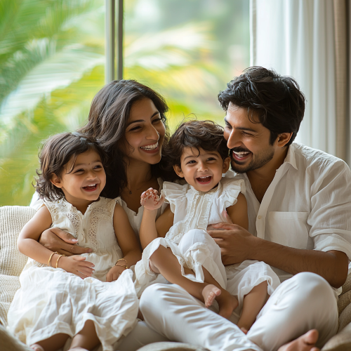 Happy Indian family of young parents and kids, playing and laughing in their home, whites and soft look, very bright, happy, healthy, premium feel, photography, ultra HD, realistic --q 2 --s 250