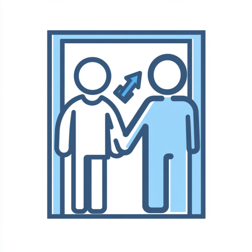 Design a clear and modern icon for office employees, indicating that they must pick up their guests from the reception. The icon should feature a simple outline of two figures: one representing an employee and the other a guest with a visible badge. Include a small reception desk or door symbol, with an arrow showing the employee guiding the guest. Use professional colours like blue, grey, and white, and ensure the design is clean and easily understandable at a glance.