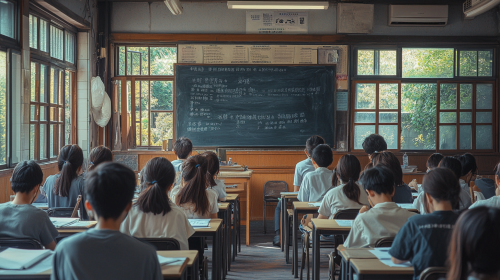 Background of a Taiwanese junior high or high school classroom, viewed from a 45-degree angle from the back corner of the room, looking toward the blackboard. The classroom is filled with students, all seen from behind, focused intently on writing their exam answers, with high detail and historical accuracy ,photograph --ar 16:9