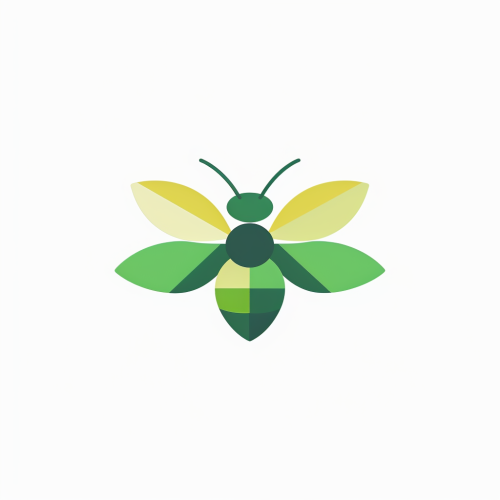 A super minimal green bee icon, represented by a small circle and two curved lines for wings, creating a very simple and abstract bee shape. No other elements, very clean and modern, on a white background. Ultra-flat vector design --ar 1:1 --v 6.0