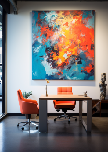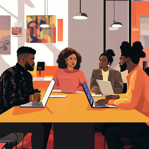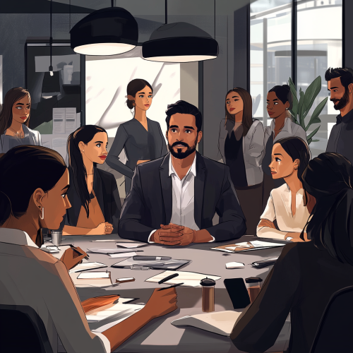 Generate a digital art for A digital art scene depicting a confident leader surrounded by a diverse team, all engaged in a collaborative discussion. The leader's expression is warm and understanding, symbolizing empathy. The background features a modern office setting with elements that suggest challenges and organizational success. Use black as the primary color for accents and details. --ar 1:1