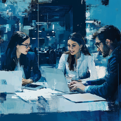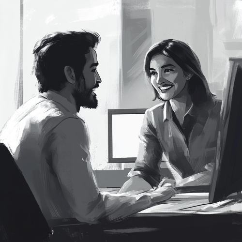 Generate a digital art for A digital art scene depicting a modern workplace where colleagues are engaged in a collaborative discussion. The atmosphere is warm and inviting, with people showing understanding and empathy towards each other. The background features a sleek, contemporary office design with subtle use of black color to highlight the importance of empathy in fostering a positive work environment. The overall mood is one of cooperation and mutual respect. Colors to be used: Black, subtle shades of grey, and warm tones. --ar 1:1