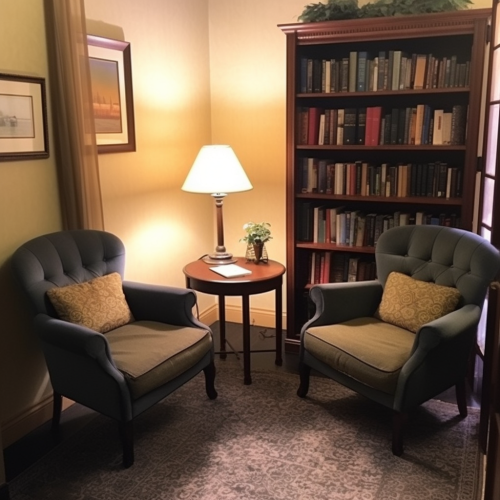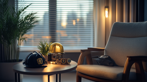 A professional therapist in a calm, softly lit office, with a firefighter’s helmet and a police badge subtly placed on a side table, symbolizing trust and understanding in mental health support. The therapist has a warm, approachable expression, and the scene has a soothing atmosphere with neutral tones and natural light, emphasizing experience, empathy, and reliability. --ar 16:9