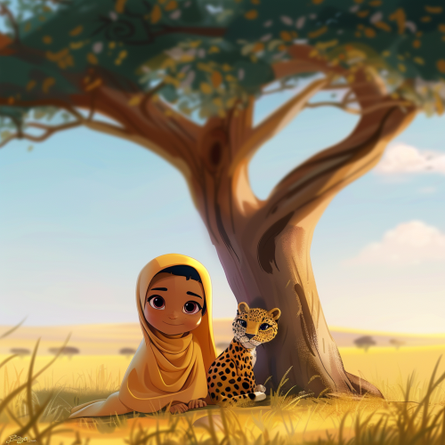 A cartoon of a young african girl and an adorable leopard sitting under an acacia tree. The african girl is wearing a hijab. Background is the african savannah. Pixar style. Cinematic UHD.