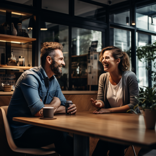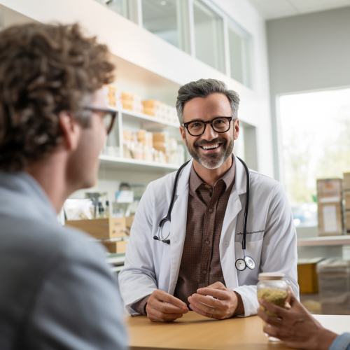 A square image capturing a doctor in conversation with a patient. The setting is a cozy and inviting doctor's office, filled with warm and natural lighting. The image showcases the doctor's empathy and approachability, with a friendly smile and attentive posture. The doctor is discussing the importance of mindful snacking during non-fasting hours for individuals with diabetes. The patient appears engaged and receptive, reflecting the easy understanding of the conversation. The colors are warm and comforting, with shades of blue and beige. The format is 1:1, perfect for Instagram. The image aims to evoke empathy, approachability, and easy comprehension, providing a visual representation of a supportive doctor-patient interaction.