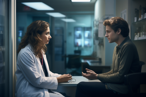 female doctor talking to a transgender male patient who is a nonbinary asexual, realistic photograph, dynamic scene in doctor's office, windows in the background, enviting environment --ar 3:2