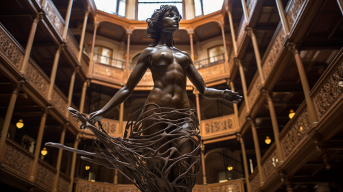 An allegorical sculpture representing what will life become in the lobby of the Bradbury Building in Los Angeles . --ar 16:9