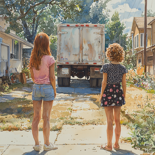back view of two young girls standing outside on a sidewalk. there is a large moving truck driving away from them. they are in a neighborhood, houses all around. its a sunny day, bright highly saturated colors. on the left is a young girl, age 12, red hair, fair skin, wearing a pink shirt, jeans, and white sneakers. on the right is a young girl, age 10, short blonde curly hair, wearing a polka dot shirt, black skirt, and sandals. water color color pencil style illustration --q 2 --s 750 --v 6.1