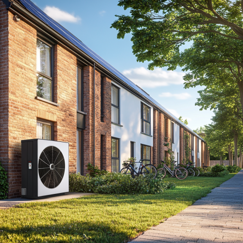 realistic side view of contemporary taylor wimpey house with cycle parked outside, air source heat pump on side of house, solar panels on roof and a tree lined street to the front with segregated cyclepath