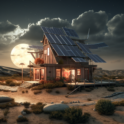 elevated ocean-front home with rooftop solar and large windows, natural light stone walk out basement, on narrow lot, house oriented long on east-west axis, with ocean off to the east, solar panels on south facing rooftop, two story with walk out basement --ar 16:9