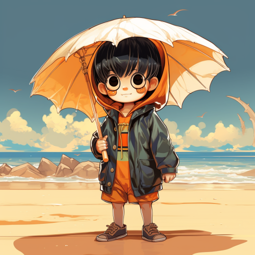 illustration of a Chinese baby A baby on a beach with sunscreen under an umbrella wearing a hat, long sleeved shirt and sunglasses. They are stood facing the viewer, full length, in manga style