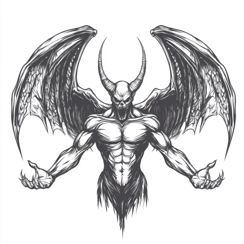 demonic demon with wings looking up and arms are out waiting to catch something in his hands, simplified illustration, white background, high contrast