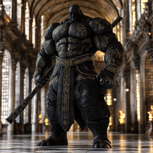 16k ultra high def large hulking monk figure in black armor decorated with golden outlines. Very muscular 9ft tall with a large staff with blade on the end all black standing in a large library of Alexandria as everything is burning around him