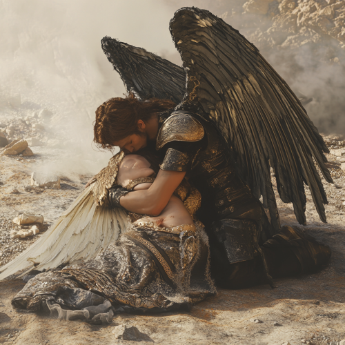 photo realistic demon kneeling on the ground, hold a dying angel laying in their arms. The angel is a beautiful ethereal woman with wings. The demon does not have wings.